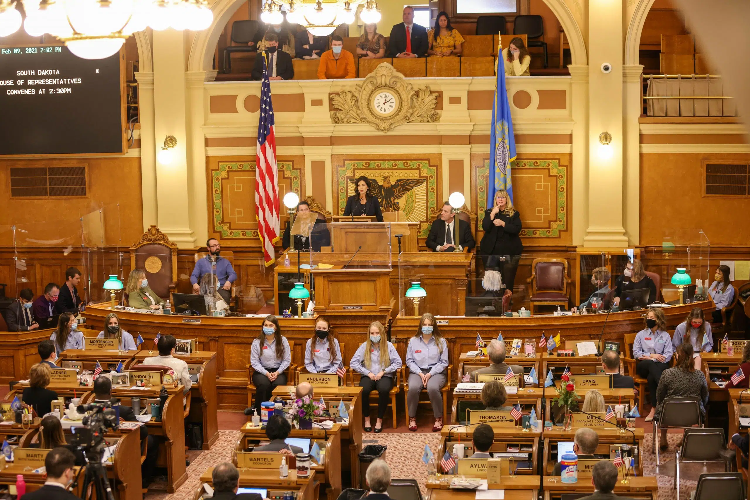 Gov. Kristi Noem speaks to a joint session of the S.D. Legislature, 2/9/21. SDBA photo by Patrick Callahan.