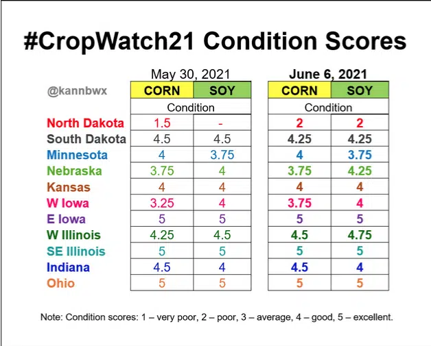The producers each week assign condition scores to their fields using a scale of 1 to 5. The ratings are similar to the U.S. Department of Agriculture’s system where 1 is very poor and 5 is excellent, but the Crop Watch condition scores do not incorporate yield assumptions.