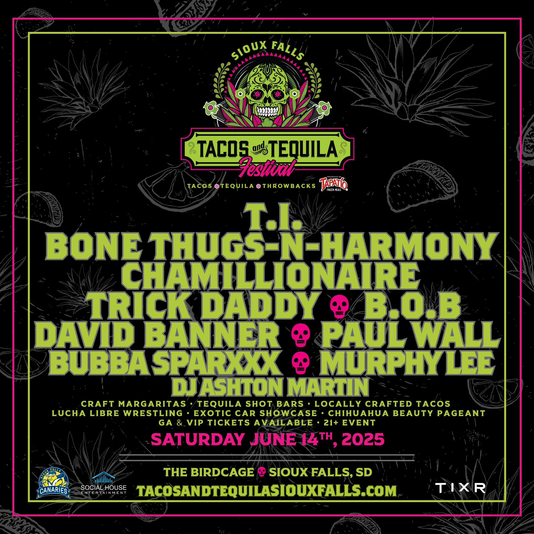 Step back into the vibrant era of the '90s and 2000s hip hop as Sioux Falls gears up for YEAR 2 of Tacos and Tequila Festival, presented by the Sioux Falls Canaries and Social House Entertainment. This throwback hip-hop festival made its debut in August 2024 and can’t wait to return with an even BIGGER lineup on June 14TH, 2025 at The Birdcage, home of the Sioux Falls Canaries!