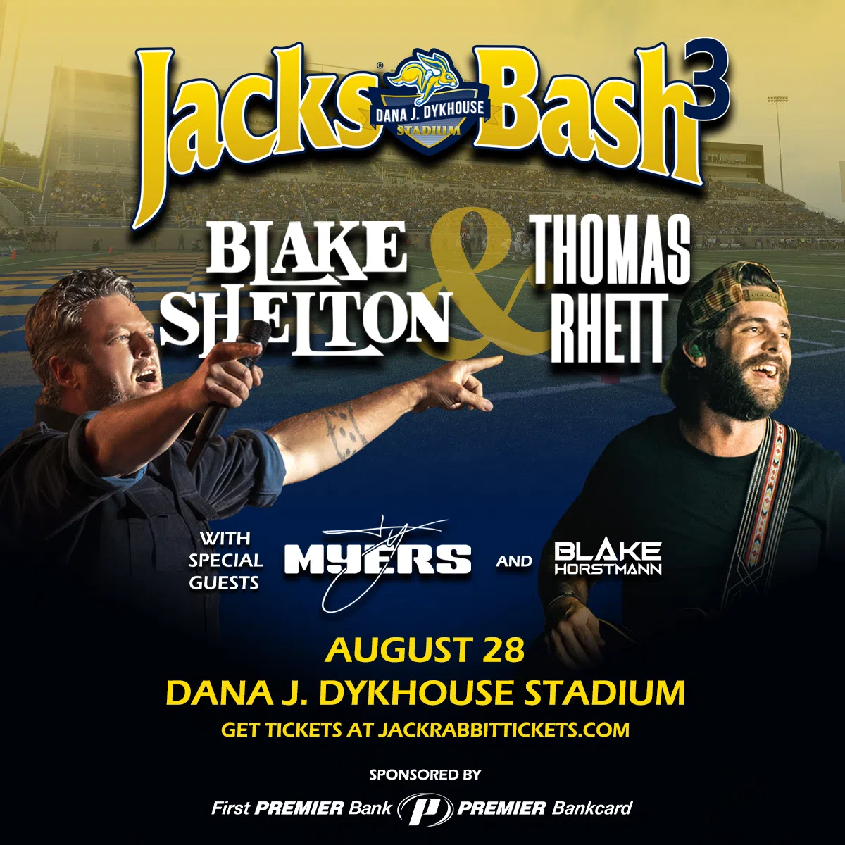 Jacks Bash 3, featuring Blake Shelton and Thomas Rhett with special guests Ty Myers and DJ Blake Horstmann, is coming to Dana J. Dykhouse Stadium on Thursday, August 28! The concert is sponsored by First PREMIER Bank and PREMIER Bankcard.
