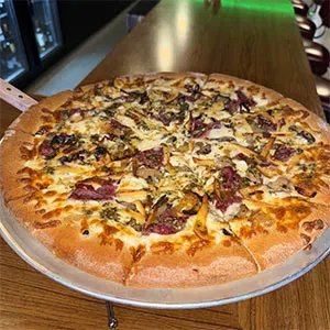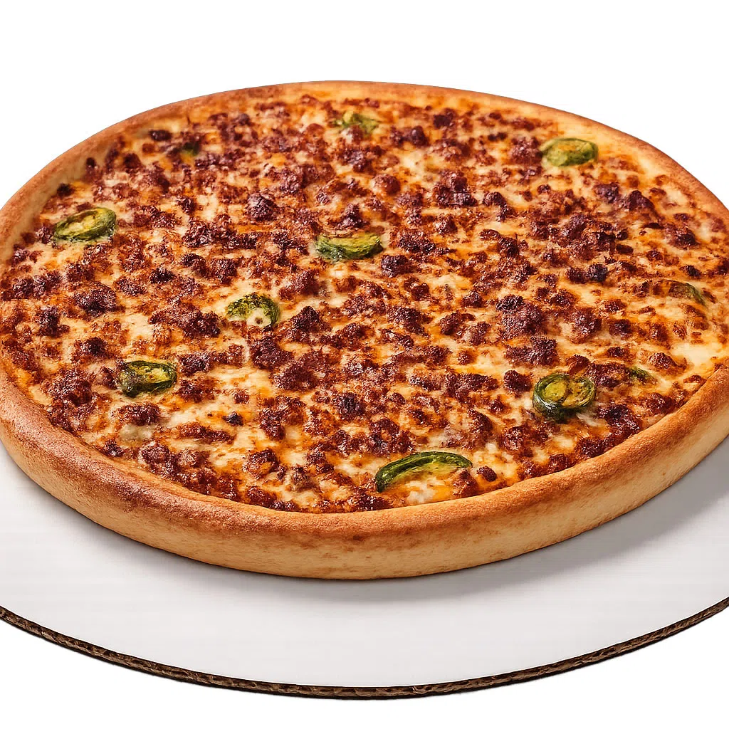 Our signature crust topped to the edge with house slow-smoked pork, zesty BBQ sauce, and shredded pepper jack cheese. This “crustless” preparation ensures a perfect balance of smoky heat and savory flavor in every bite.