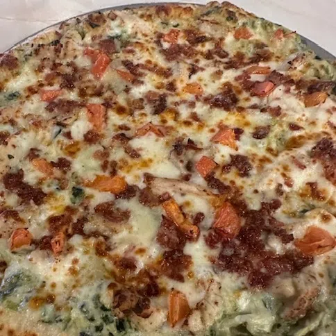 Buffalo-ranch sauce, garlic chicken, white onion, jalapeños. Cream cheese, cheddar & mozzarella, bacon.