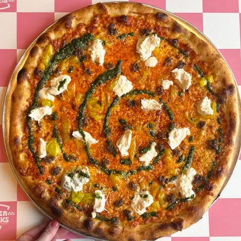 Built on our two-day fermented dough and baked hot at 605 degrees in our stone deck oven. It starts with house-made vodka sauce, then gets house-made bison sausage, mozzarella, and tangy banana peppers for a bright crunch. Post-bake, the pizza is finished with drops of fresh, creamy burrata and a drizzle of house-made pesto. Available all February by the slice from 11 AM – 3 PM, or as a whole pie in 18-inch, 12-inch, and 12-inch Gluten-Free options. It is a signature pie that defines the Pizza Cheeks standard: using local soul and scratch-made technique to elevate the craft of pizza in Sioux Falls.